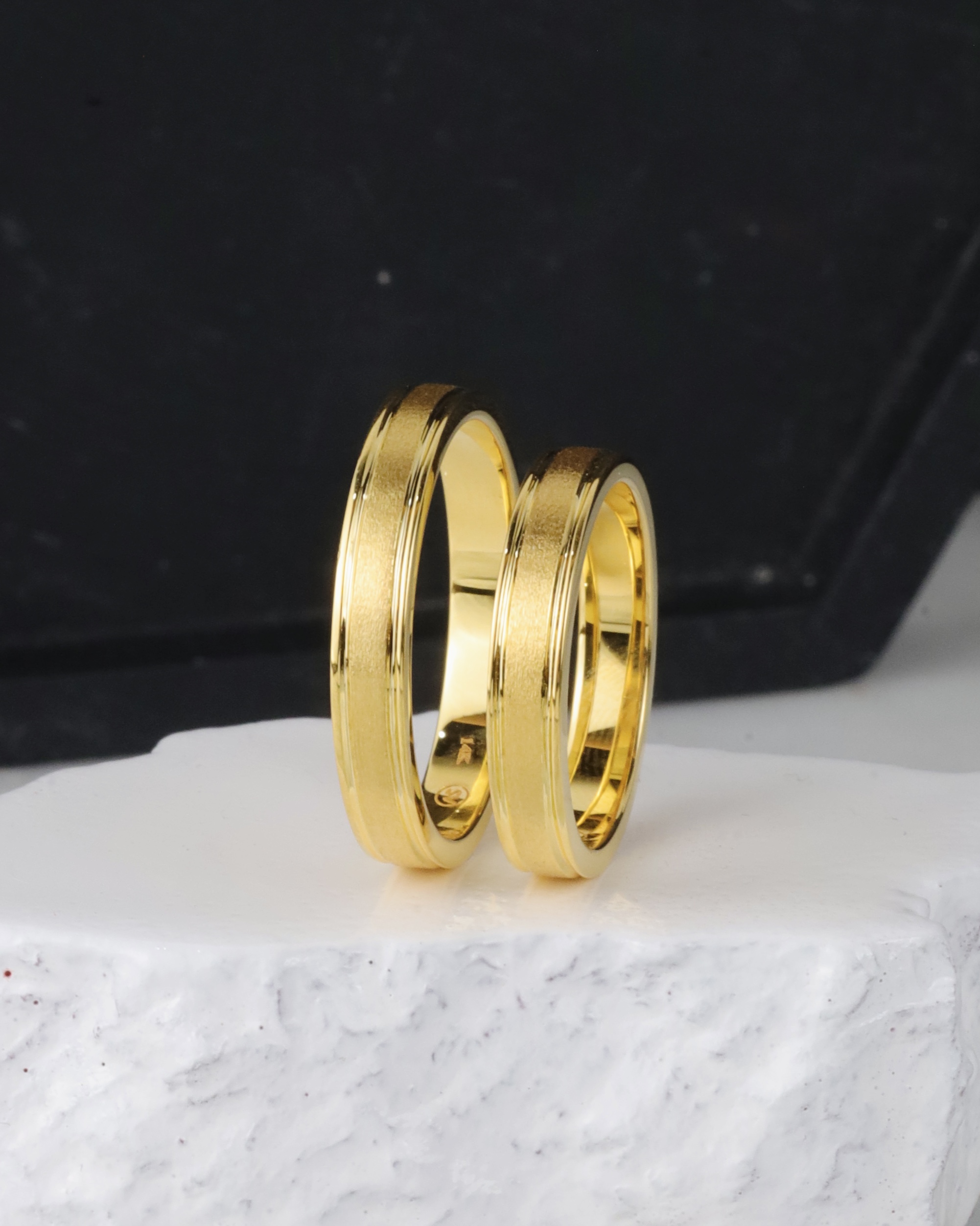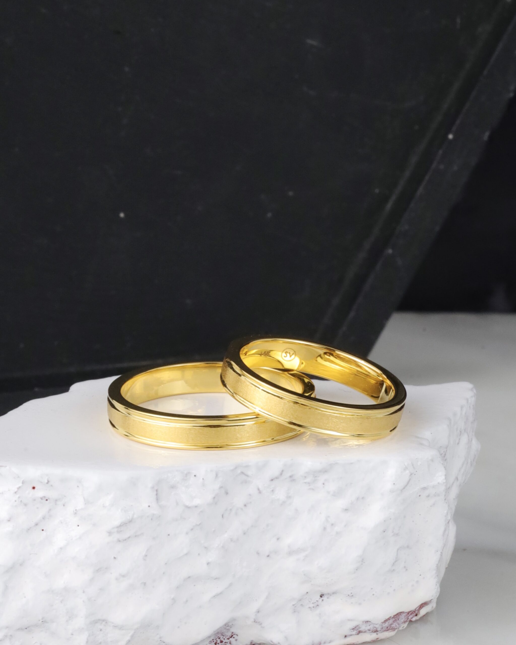 BRIDE’S RING Width: 3.5 mm  Thickness: 1.5 mm Ring Size: 5.5 ( Can be resized 2 sizes bigger and 2 sizes smaller ) Metal: 14 Karat Yellow Gold Weight: (approx.) 3.45 grams  Matte#2 & Polished     GROOM’S RING  Width: 4.5 mm Thickness: 1.5 mm Ring Size: 8.5 ( Can be resized 2 sizes bigger and … Continued