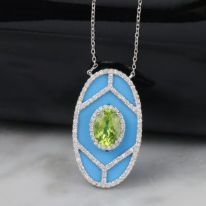 1 pc (approx.) 1.25 Carat Natural Peridot 1 pc (approx.) 2.42 Carat Natural Turquoise 118 pcs .47 CTW Round Cut Diamonds (SI Clarity; FG to GH Color) Face Illusion: 2.00 Carat (9.8mm) Imported Setting Length of Chain: 18” (Adjustable) Metal: 14 Karat White Gold Weight: (approx.) 3.22 grams