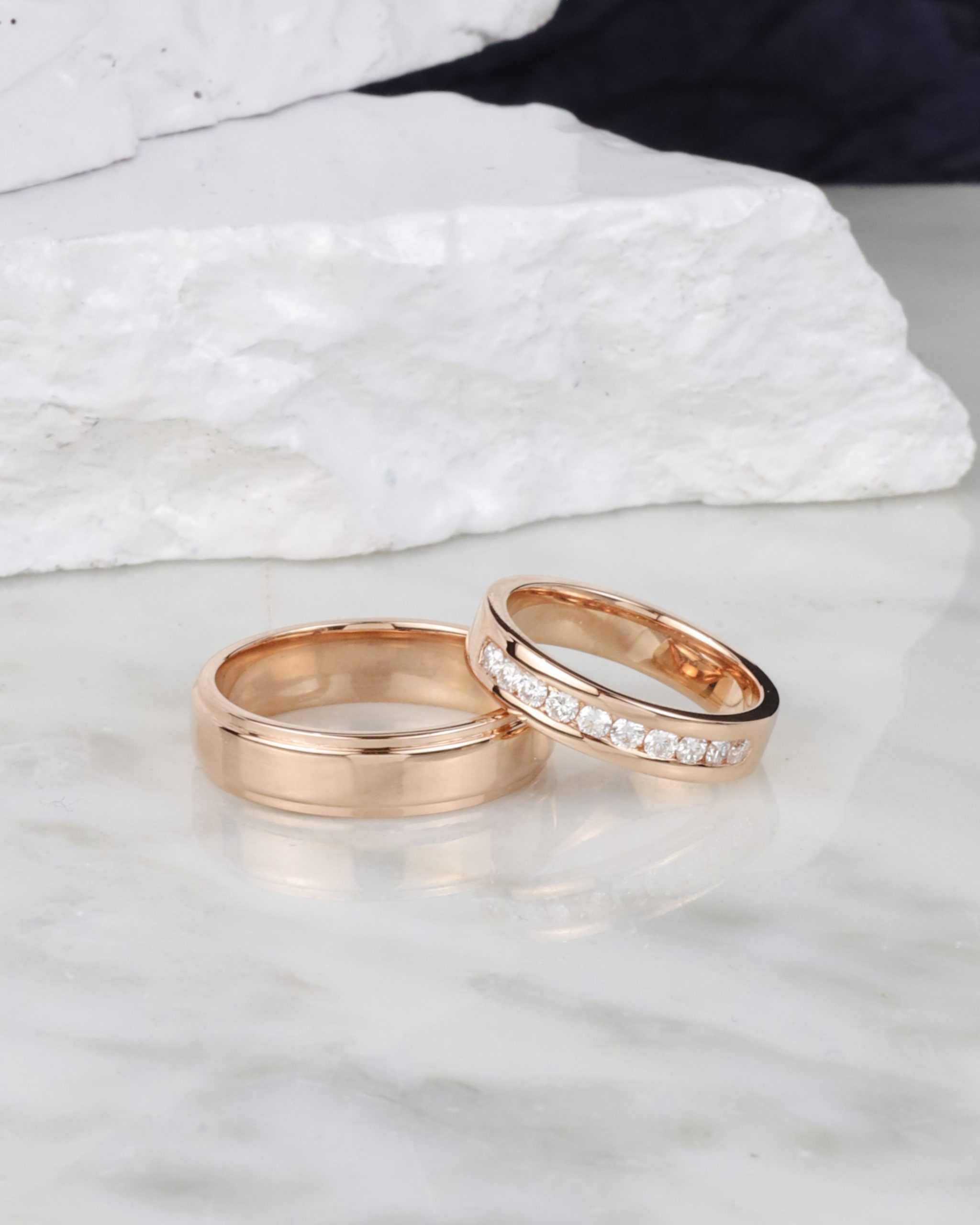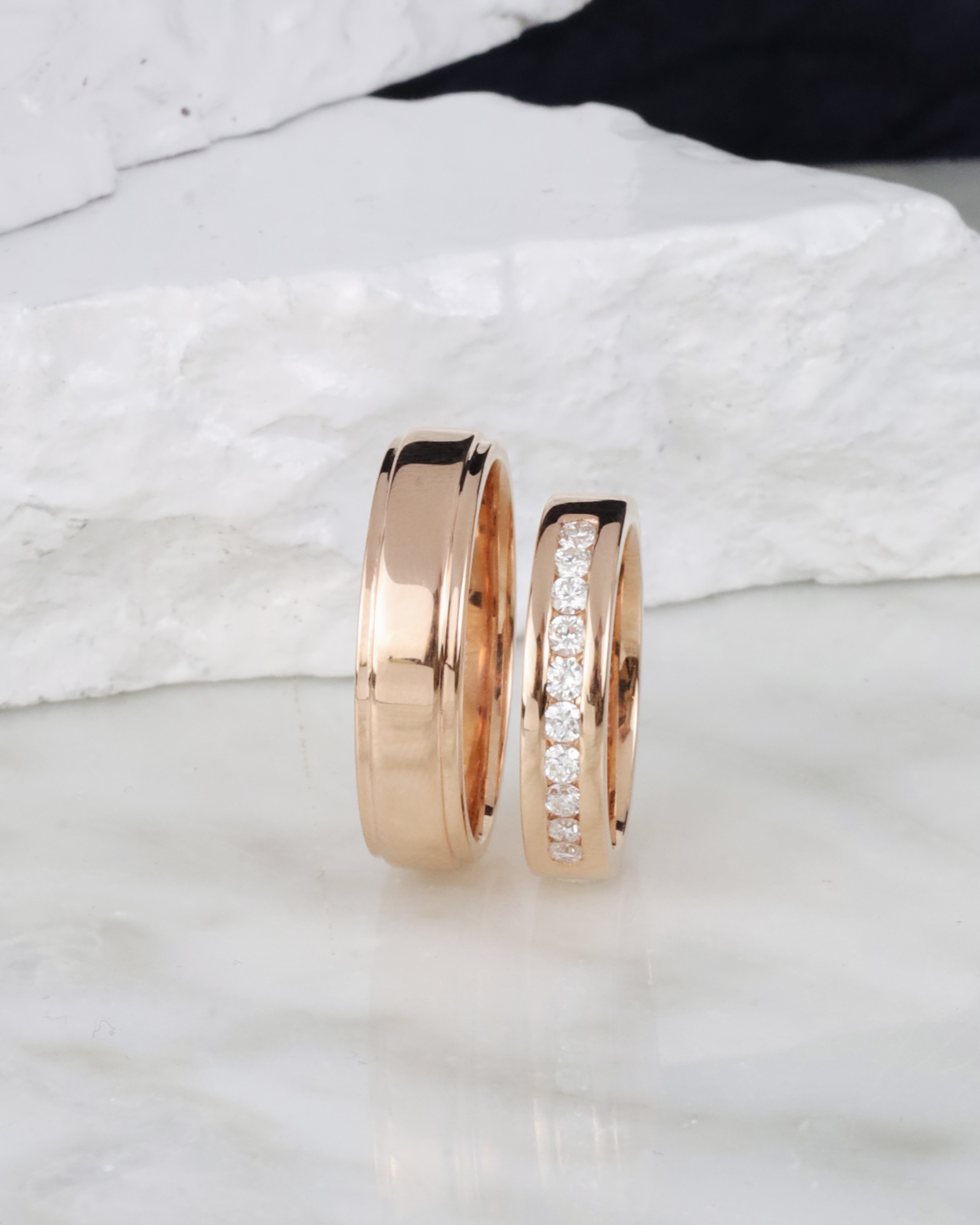 Bride’s Ring 10pcs (approx.) .03 Carat Round Cut Diamonds (VSI-SI Clarity; GH Color) Width: 4.1mm Thickness: 1.6mm Ring Size: 5.5 (Can be resized 1 size bigger and half size smaller) Metal: 18 Karat Rose Gold Weight: (approx.) 5.02 grams Polished Groom’s Ring Width: 5.3mm Thickness: 1.7mm Ring Size: 9 (Can be resized 2 sizes … Continued