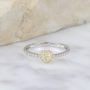 .27 Carat Round & Heart Shaped Diamonds  (VSI-SI Clarity; Fancy Yellow (IJ) Color) .12 CTW Round Cut Diamonds (SI Clarity; GH to HI Color) Face Illusion: .65 Carat   Imported Setting Ring Size: 7.5 (Can be resized half size bigger and half size smaller) Metal: 18 Karat White & Yellow Gold Weight: (approx.) 1.67 grams … Continued